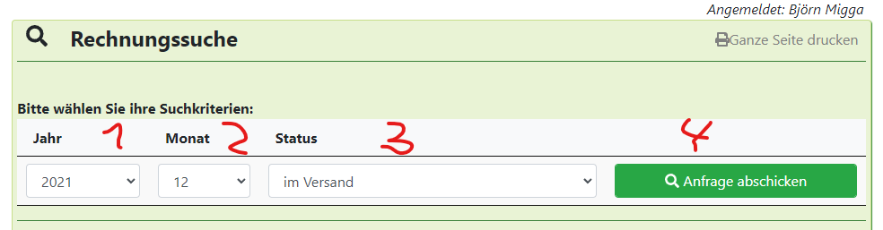 Es müssen nicht alle Felder ausgefüllt werden. Man kann nur nach dem Jahr suchen oder Jahr und Status der Rechnung.